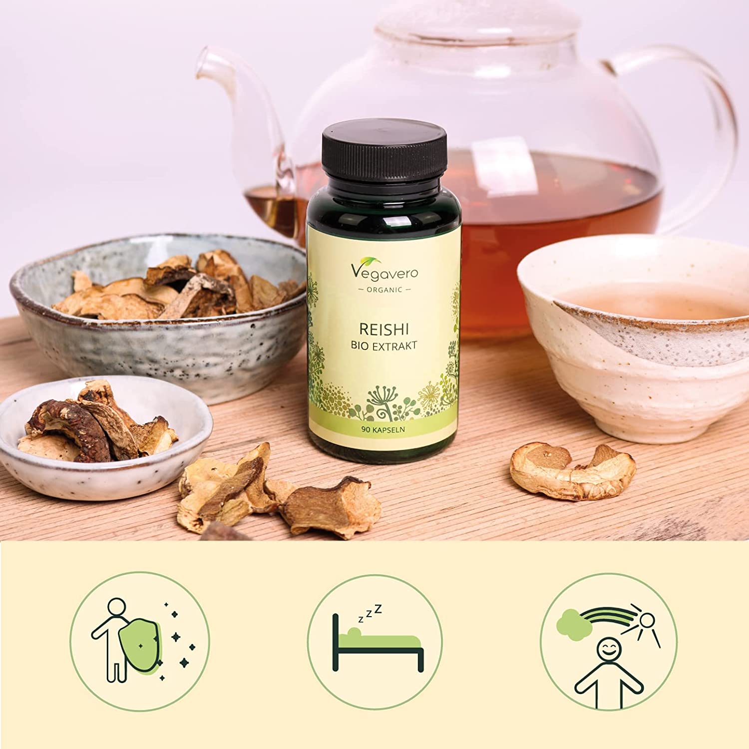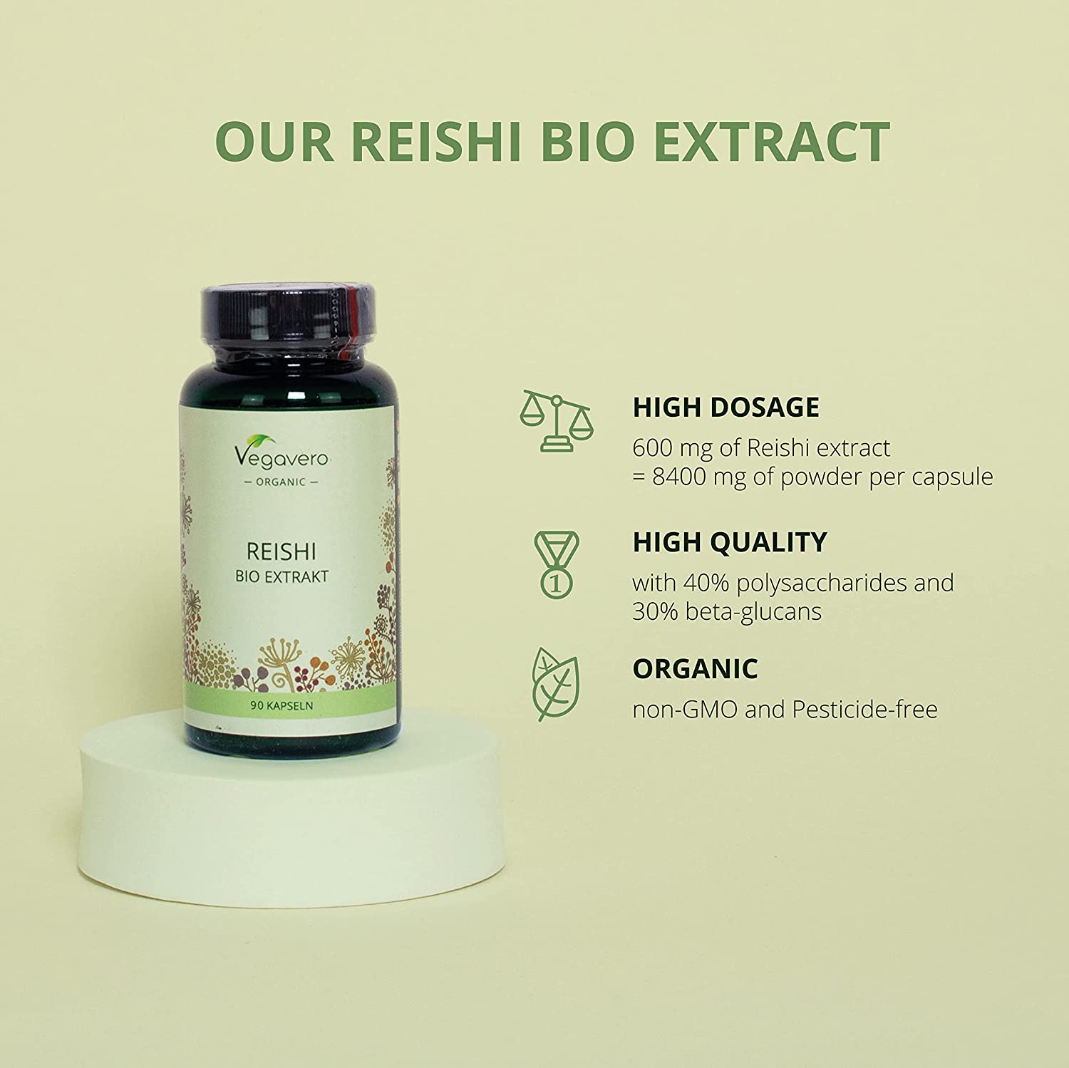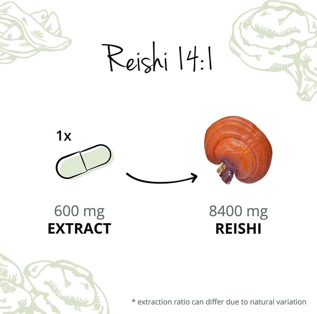 - ⭐ EXTRACT – NOT POWDER: While other suppliers only offer Reishi powder capsules, our product provides 500 mg of a highly dosed mushroom extract (~ 14:1) from controlled organic cultivation. This corresponds to 7000 mg of dried organic Reishi powder. The advantage of an extract is not only the higher amount of Reishi in one capsule, but also the higher concentration of bioactive substances, and a better bioavailability of the reishi supplement.